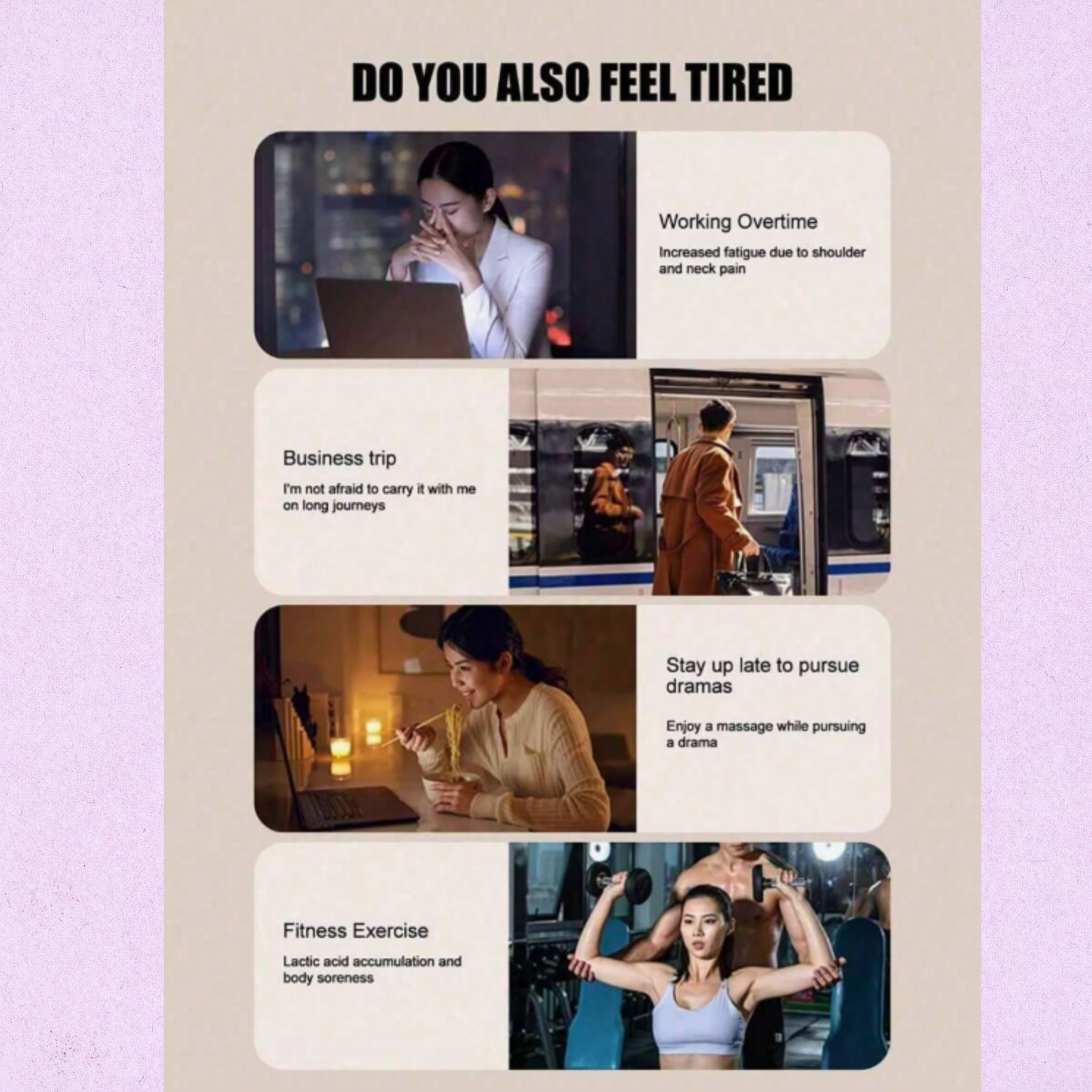 - Helps reduce fatigue after long workdays